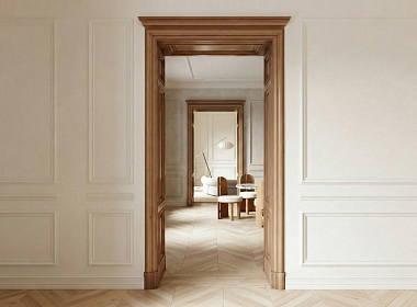 Статусное оформление межкомнатных проемов в классическом стиле. Порталы изготовлены из комбинации массива дуба и стабильного шпонированного МДФ. Дизайн отличается сложной архитектурой: использованы традиционные филенки и объемные декоративные элементы, придающие конструкции торжественность.